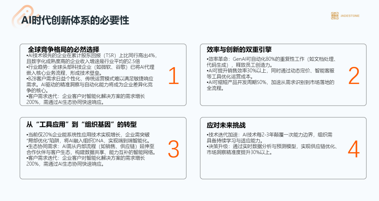 AI重塑商业未来意义非凡。它既是全球竞争格局的必然选择,能让企业精准洞察市场需求,快速响应变化,又是效率与创新的双重引擎,可缩短产品开发周期50%,加速从需求识别到市场落地的全流程。企业需将AI创新融入组织DNA,实现从“工具应用”到“组织基因”的转型,具备持续学习与适应能力,并从内部流程延伸至合作伙伴与客户生态,构建数据共享、能力互补的智能网络,应对未来挑战。