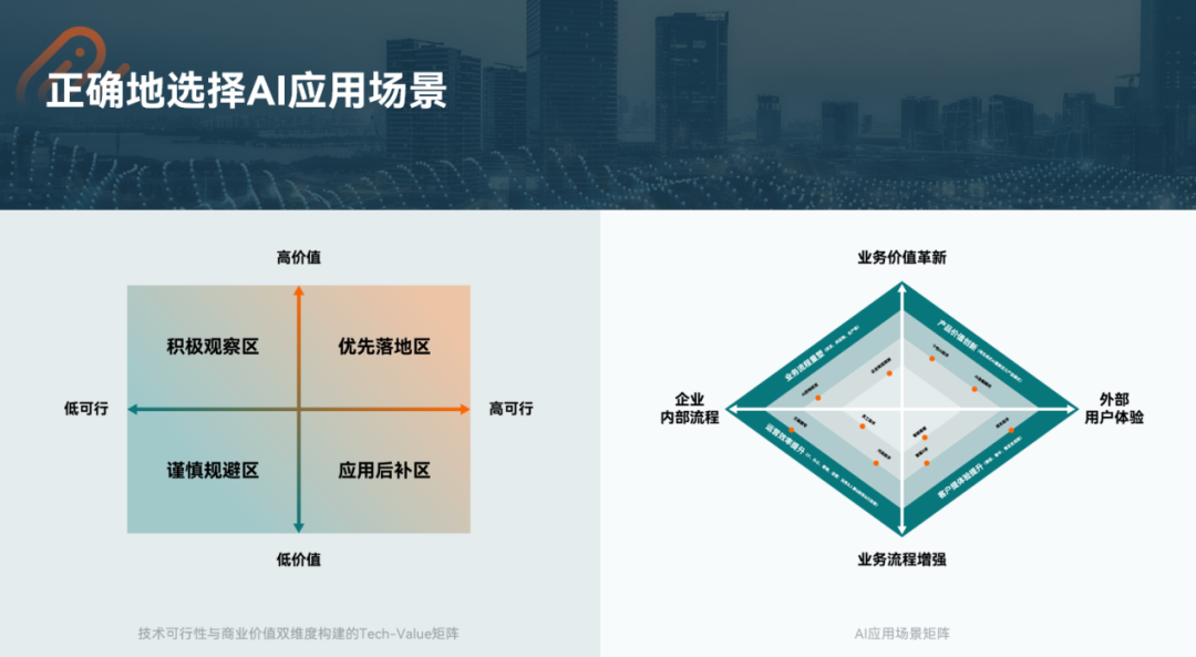 超40%的企业因场景选择不当导致项目流产,企业应专注于场景的细分需求,结合业务流程问题,寻找AI可实现的最佳落地点,更快地为企业提供商业价值优先落地,场景需满足“高重复高成本高价值、痛点明确、数据可获取质量高、可量化改进”。企业可通过构建技术可行性与商业价值双维度构建的Tech-Value矩阵来选择AI应用场景,在矩阵中,纵轴表示业务价值,横轴表示技术可行性。将潜在场景放入矩阵中,高价值且高可行性的场景优先选择。比如制造业,预测性维护业务价值高,能减少设备故障停机时间,且技术相对成熟,可作为优先突破点;金融业,反欺诈业务价值高,能降低坏账损失,技术可行性也较高,同样值得优先考虑。从这些场景切入,企业能以较小的投入快速看到AI带来的成效,树立信心,为后续AI应用奠定基础。